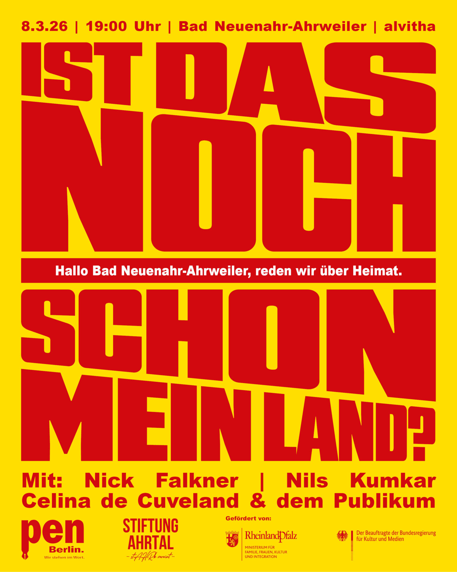 Am 8. März 2026 ist PEN Berlin im Rahmen der landesweiten Gesprächsreihe „Hallo Rheinland-Pfalz, reden wir über Heimat“ zu Gast in Bad Neuenahr-Ahrweiler. Die Veranstaltung beginnt um 19:00 Uhr im alvitha.